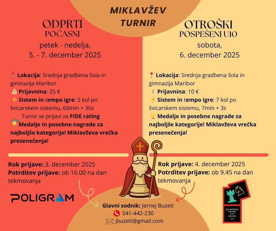 Razpis Prijava Razpis → Razpis/ STANDARD – OPEN→ Razpis/ RAPID – U10 Prijava Na turnir se je potrebno prijaviti Jerneju Buzetiju:e-pošta: jbuzeti@gmail.com,tel. št.: 041 442 230.Za več informacij glej RAZPIS-a!